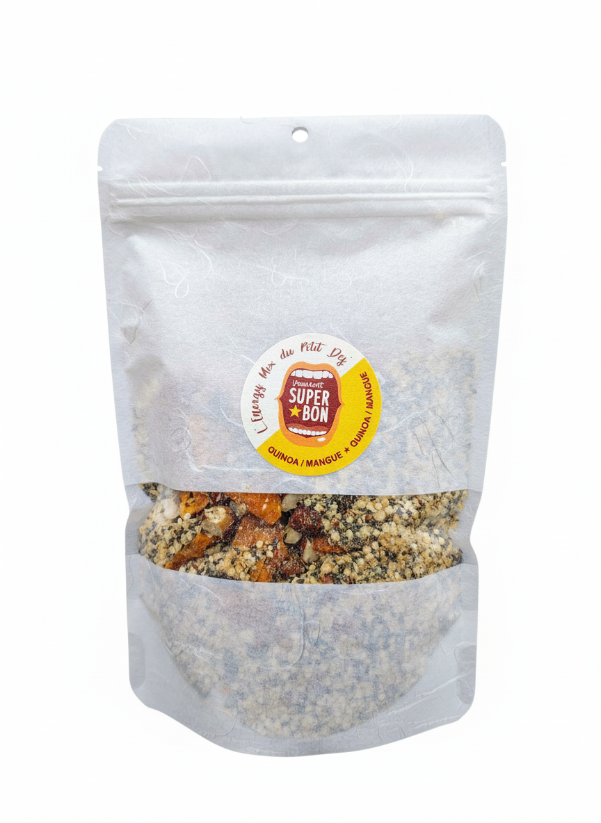 Ingrédients (issus de l'agriculture biologique sauf *) : graines de chia, flocons de quinoa belge et hollandais, mangues séchées, noisettes, graines de chanvre belge, raisins secs. C'est tout !